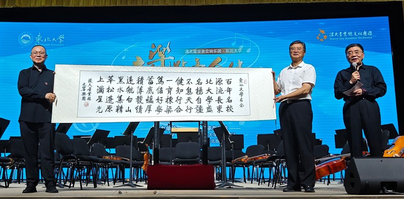 徐峰代表2人麻将 接收满天星业余交响乐团赠送的艺术作品,该作品融入东北大2人麻将 名、校训以及办学区位、定位等元素,雄浑的书法与百年名校的底蕴相互交织。